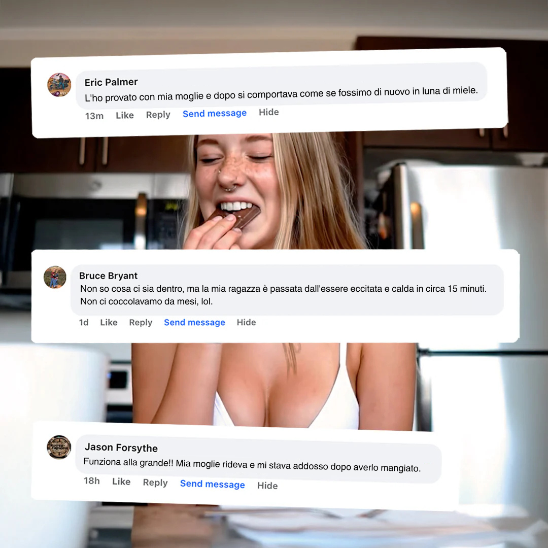 Non mi aspettavo molto da un “cioccolato dell’umore”, ma wow… funziona davvero. Ho condiviso una barretta con la mia ragazza prima dell’appuntamento e l’energia tra noi era ad un altro livello. Rideva, mi toccava in continuazione e continuava a dirmi che ero “ancora più carino del solito”. Ne prenderò altro prima che finisca.